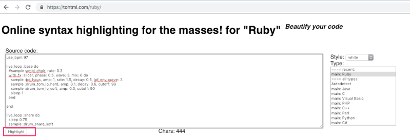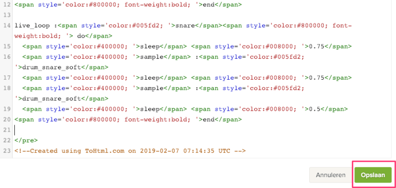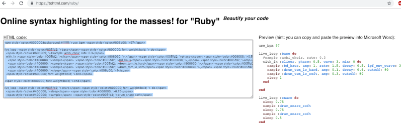 Sonic Pi geeft de codes in verschillende kleuren. Om de code leesbaar te houden maak je  gebruik van een speciale website die de Sonic Pi code omzet naar HTML: